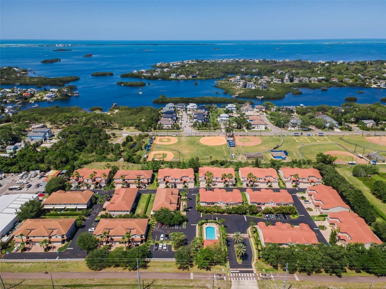NOT EVERY UNIT IN THE VILLAS OF SAN MARINO LIVES THE SAME. At 2,538 square feet, this end unit is the community's largest floor plan, offering a noticeably more open feel with the light and breathing room that come with an end-of-row position and no neighboring building on one side. The main living area is anchored by hardwood floors and filled with natural light from east and south exposures. The kitchen features granite countertops, stainless appliances, a cooking island, and a closet pantry. Fresh interior paint has been applied throughout the entire first floor, the high-volume stairwell, and the upstairs hallway. An open wood staircase leads to the second level, where the upper hallway features an open railing rather than the common closed drywall. Hardwood continues through the stairs and upper hall, while bedrooms are finished with newer LVP flooring. The primary bedroom is notably large, providing enough space for a private reading nook, a home office, or a dedicated workout area. It includes a private balcony with space for seating. While located along Alt 19, the interior is quiet. This is one of the original units built with a concrete block demising wall through to the second floor - a rare construction detail not found in later builds that provides exceptional sound separation. POSITIONING WITHIN the community is a distinct advantage here. As an end unit facing a wider street, the home avoids the boxed-in feel found in typical sections, with a front entry that doesn't look directly into a neighbor's door. The outdoor space features a spacious screened, tiled rear patio - a finished upgrade over the standard concrete - positioned to enjoy morning sun and comfortable afternoon shade. Residents enjoy a heated pool, and the Pinellas Trail sits just outside the gates, with walkable favorites like Thirsty Marlin and The Salty Lime nearby. The association is financially sound with strong reserves and proactive planning. The monthly fee covers exterior maintenance, roof, landscaping, cable, internet, and trash - with exterior painting completed in 2023. Located in Flood Zone X500 (no flooding history) and zoned for Palm Harbor University High, Palm Harbor Middle, and Ozona Elementary. This is a refreshed, substantial end-unit townhome in Villas of San Marino at Palm Harbor with a layout widely considered the best in the community, exceptional sound separation, and a feel that is hard to duplicate.