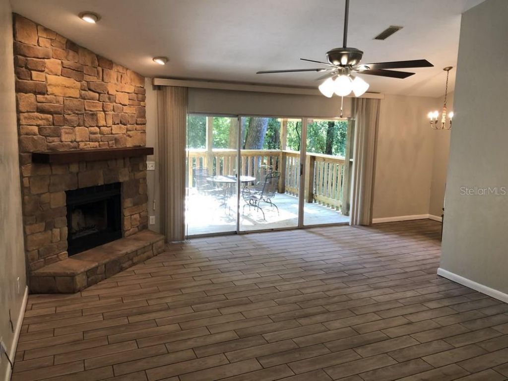 2 Large bedrooms, 2 Bathrooms with living room, dining area, kitchen, and a 2-car garage. The kitchen, hallway, and entryway have ceramic tile, while the rest of the house has burbur carpet. The house has a split floorplan with a bedroom and bathroom on one side of the house, and the master bedroom and bathroom on the other side. The kitchen opens to a dining area, and the living room has vaulted ceilings. Sliding glass doors in the dining area open to a deck and a fenced back yard. The house borders a golf course and has a view of a green. The laundry hookups are located in the garage. The house is located in a nice, secluded neighborhood bordering a golf course. There is instant access to I-75 and Santa-Fe community college is close by.